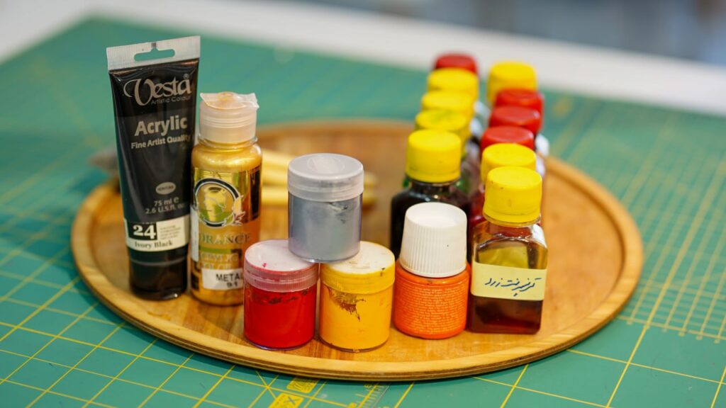 - آمادهسازی رنگ: رنگهای معدنی معمولاً به صورت پودر هستند. پودر را با آب و یک ماده تثبیتکننده (مانند سرکه یا نمک) مخلوط کنید تا رنگ آماده شود.