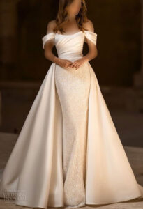 - دو حالت مختلف: این لباس شامل یک دامن بلند و باشکوه است که قابلیت جدا شدن دارد و پس از جدا شدن، به یک لباس کوتاه و شیک تبدیل میشود. این امکان به عروس اجازه میدهد که در طول مراسم از هر دو استایل بهرهمند